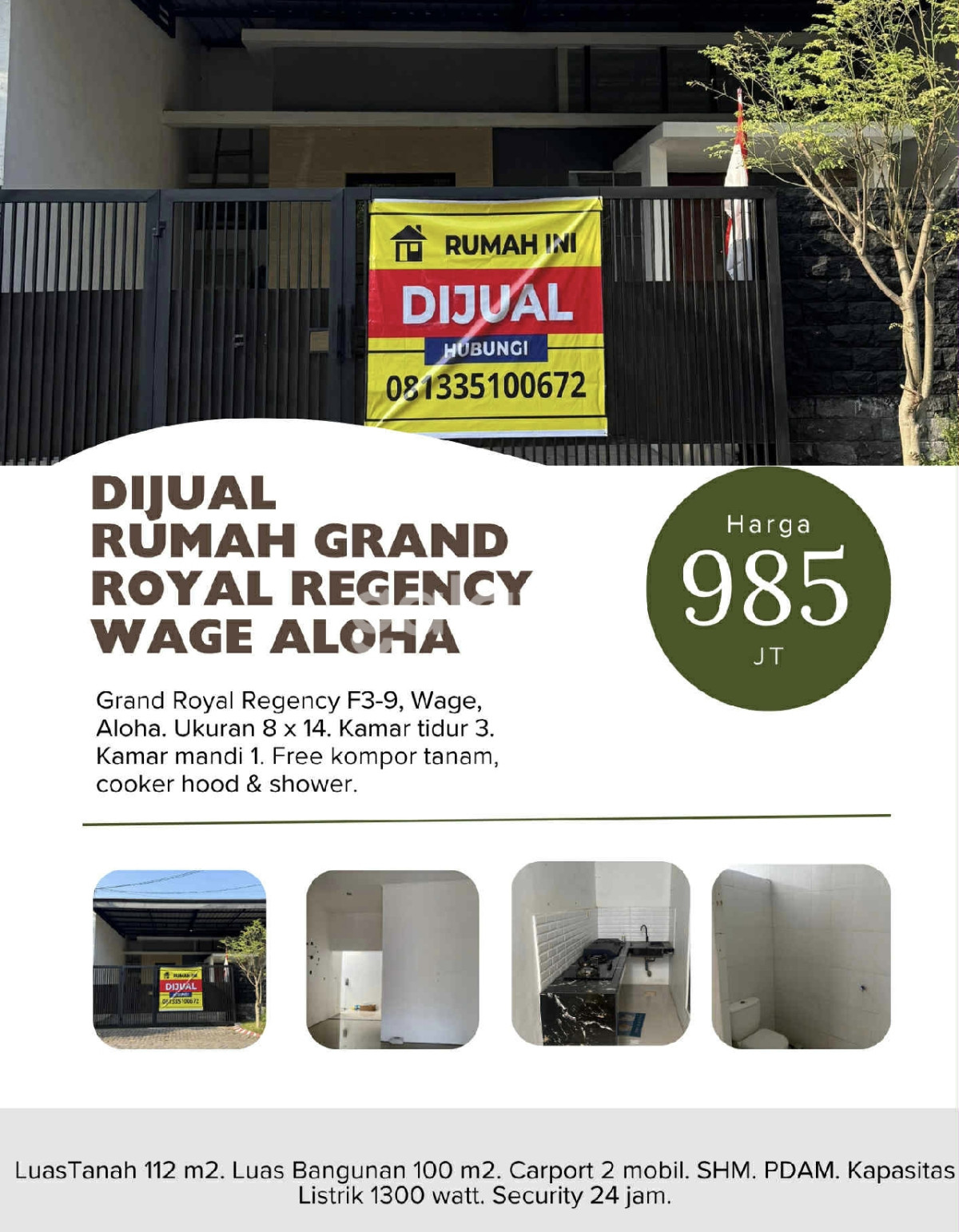 Rumah dijual di Grand Royal Regency Wage Aloha menawarkan hunian nyaman di lokasi strategis. Cocok untuk keluarga yang mencari rumah dengan lingkungan aman dan fasilitas lengkap. berikut spesifikasi nya : - Luas lahan 112 m² - Luas bangunan 100 m² - 3 Kamar tidur - 1 Kamar mandi - Carport untuk 2 mobil - Listrik 1300 watt - Sumber air PDAM - Fasilitas perumahan: Keamanan - Perabotan: KOMPOR - Kondisi: Bagus - Arah: utara - Harga: Rp.983.000.000 Jangan lewatkan kesempatan memiliki rumah idaman yang menawarkan hunian nyaman di lokasi strategis! Rumah ini sangat cocok untuk keluarga yang mencari lingkungan yang aman, tertib, dan didukung dengan fasilitas lengkap di salah satu perumahan paling diminati di Sidoarjo.