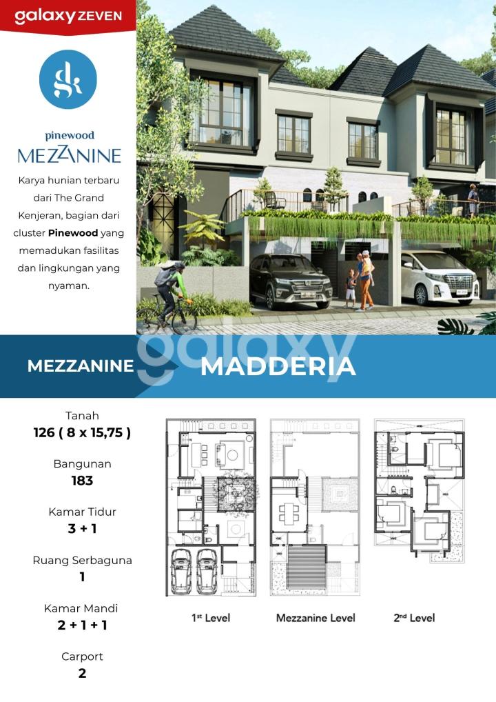 pri-tgkMez2-3 JUAL RUMAH BARU MEZZANINE AMERICAN TROPICAL HOUSE THE GRAND KENJERAN SURABAYA Grand Kenjeran Mezzanine adalah tipe terbaru yang ditawarkan dalam Cluster Pinewood di perumahan The Grand Kenjeran, Surabaya Timur. Ruang multifungsi tambahan menjadi ciri khas utama tipe Mezzanine yang mengusung desain American Classic. The Grand Kenjeran Mezzanine/ split level juga menyediakan pilihan rumah 2 lantai yang memberikan kesan mewah dan memaksimalkan fungsi ruang. >> TIPE MADDERIA CAPITAL 2 LANTAI Luas Tanah 126 m² ( 8x15,75 ) Luas Bangunan 173 m² 2 Lantai, Tanpa Perabot Kamar Tidur 4+1 Kamar Mandi 3+1 2 Carport Taman depan PLN 3.500 Hadap Selatan / Utara Sertifikat HGB Harga Rp. 4.114.034.574* >> TIPE MADDERIA MEZZANINE/ SPLIT LEVEL Luas Tanah 126 m² ( 8x15,75 ) Luas Bangunan 183 m² 2,5 Lantai, Tanpa Perabot Kamar Tidur 3+1 Ruang Serbaguna 1 Kamar Mandi 2+1 Kamar Mandi Tamu 1 2 Carport Taman depan PLN 5.500 Hadap Selatan / Utara Sertifikat HGB Harga Rp. 4.435.471.635* >> TIPE MARJORIA CAPITAL 2 LANTAI Luas Tanah 141,75 m² ( 9x15,75 ) Luas Bangunan 187 m² 2,5 Lantai, Tanpa Perabot Kamar Tidur 4+1 Kamar Mandi 3+1 2 Carport Taman depan PLN 3.500 Hadap Selatan Sertifikat HGB Harga Rp. 4.462.733.897* >> TIPE MARJORIA MEZZANINE/ SPLIT LEVEL Luas Tanah 141,75 m² ( 9x15,75 ) Luas Bangunan 187 m² 2 Lantai, Tanpa Perabot Kamar Tidur 4+1 Ruang Serbaguna 1 Kamar Mandi 3+1 2 Carport Taman depan PLN 5.500 Hadap Selatan Sertifikat HGB Harga Rp. 4.894.115.015* >> TIPE MALDRIAN MEZZANINE/ SPLIT LEVEL Luas Tanah 144 m² ( 8x18 ) Luas Bangunan 210 m² 2,5 Lantai, Tanpa Perabot Kamar Tidur 3+1 Ruang Serbaguna 1 Kamar Mandi 2+1 Kamar Mandi Tamu 1 2 Carport Taman depan PLN 5.500 Hadap Utara Sertifikat HGB Note Harga* : - Bisa berubah sewaktu-waktu - Termasuk PPN, Biaya AJB, Balik Nama - Belum termasuk BPHTB FASILITAS OUTDOOR : - Sunshine Kids Club - Pinepond - Pet Fairground - Oudoor Gym - One Gate System - Smart Home System LOKASI & JARAK : 1 km - Alfamart The Grand Kenjeran 1,4 km - Raya Kenjeran 2 km - RS Mitra Keluarga 2,3 km - Raya MERR, RS Ibu Anak Kendangsari Merr 5,4 km - Pakuwon City Mall 6 km - Galaxy Mall 8,2 km - Stasiun Gubeng 19 km - Juanda Airport SPESIFIKASI BANGUNAN : 1) PONDASI : - Tiang pancang 2) DINDING : - Kamar mandi Finishing keramik ex. Roman Tiles - Facade depan phomi clay motif travertine a. Mezzanine - Utama Bata press merah press - Dinding shower Granit black impala b. Capital - Utama Bata press plester aci - Dinding shower Granit hero absoluto 3) LANTAI : - Ruang Utama Granit 60x60 ex. Roman - Kamar Mandi/service Finishing keramik - Tangga parquette flooring ex. Merbau - Dack balkon atas carport finish conwood 4) PLAFOND : - Interior Gypsum board finishing cat Exterior - Eksterior MR board finishing cat 5) ATAP : - Rangka atap baja ringan - Penutup genteng beton flat ex. Monier 6) PINTU & JENDELA : - Daun pintu utama Kayu solid* - Daun pintu dalam Kayu semi solid* - Kusen pintu utama Kayu solid* - Kusen pintu dalam Kayu solid* *core engineering - finishing duco - Hardware Accesories by Dekkson - Jendela aluminium Aluminium YKK Finish goods 7) SANITAIR : - Wastafel, monoblok, kran, dan shower ex. TOTO 8) FITUR KEAMANAN - SOS Button, CCTV, Smart Lock dan Smoke Alarm 9) LISTRIK : - 3.500w ( 2 Lantai ) - 5.500w ( Mezzanine) 10) AIR BERSIH : - PDAM + tandon bawah 1,5 m³