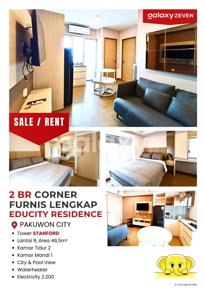 axz2484 JUAL SEWA APARTEMEN EDUCITY 2 BEDROOM CORNER FURNIS MEWAH Stanford, Lantai 9 Luas Bangunan 46.5 Kamar Tidur 2 Kamar Mandi 1 Pool View Hadap Utara & Timur Sewa 60 Jt/th Nego Jual 680 Jt Nego FASILITAS : - Private Lobby - Free Akses to Swimmimg Pool - Free Akses to Gym/Fitness - Tempat Bermain Anak (free) - Jogging Track (free) - Free 1 Parking Lot - Laundry Shops - Convenience Stores/mini marts - Depot, Pujasera - Apotik LOKASI & JARAK : 50m - Sekolah Gloria 260m - Sekolah Xin Zhong 350m - Pakuwon City Mall 700m - Universitas Widya Mandala Pakuwon City 1 km - Sekolah Cita Hati 2,7 km - ITS (Institut Teknologi Surabaya) 5 km - RS Mitra Keluarga Kenjeran 5,3 km - Galaxy Mall 6 km - Unair Kampus C 8,1 km - Unair Kampus B 20 km - Juanda Airport