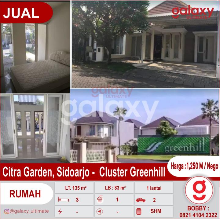 Di jual Rumah Citra Garden, Sidoarjo Cluster Greenhill Luas Tanah : 135 m² Luas Bangunan : 83 m² Dimensi : 9 x 15 m² Bangunan 1 lantai Full Furnish Kamar Tidur : 3 Kamar Mandi : 1 Carport 2 mobil Row jalan 2 mobil Sertifikat : SHM Harga : 1,250 M / Nego More Info : Bobby Galaxy Ultimate