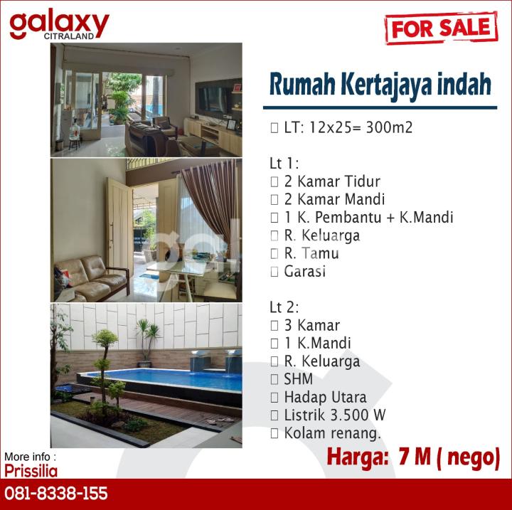 Dijual cepat Rumah di Kertajaya indah LT: 12x25= 300m2 Lt 1: 2 Kamar Tidur 2 Kamar Mandi 1 K. Pembantu + K.Mandi R. Keluarga R. Tamu Garasi Lt 2: 3 Kamar 1 K.Mandi R. Keluarga SHM Hadap Utara Listrik 3.500 W Kolam renang. Harga: 7 M ( nego) Hubungi Prissilia Galaxy Citraland