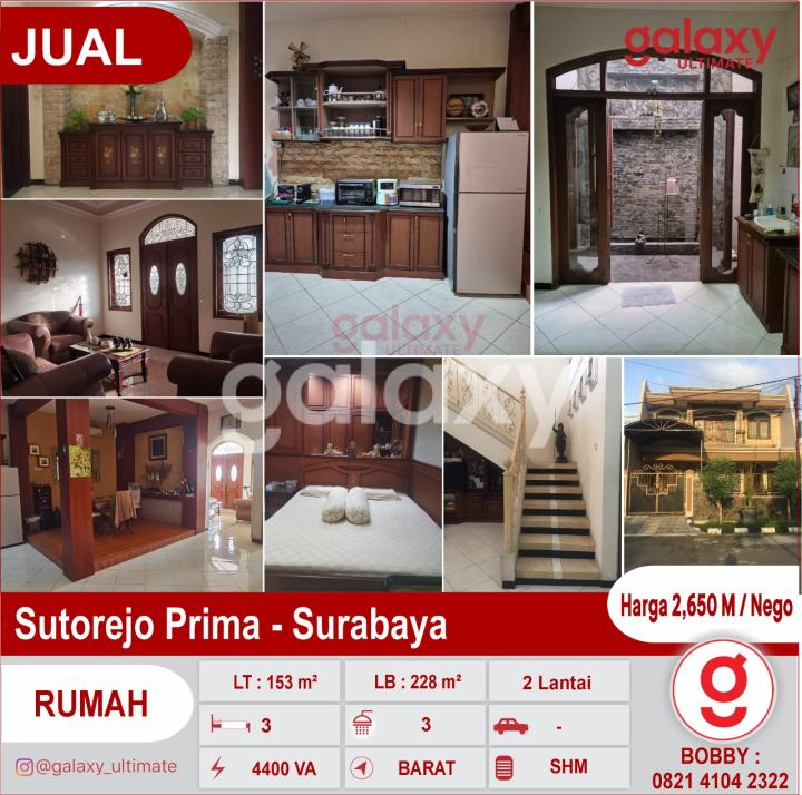 DIJUAL RUMAH Sutorejo Prima - Surabaya Sertifikat Hak Milik 2 lantai , furnished Luas Tanah : 153 m² Dimensi 9 x 17 m² Luas Bangunan 228 m² dengan balkon Daya Listrik 4400 VA - 3 kmr tidur dengan perabot lemari, meja kerja ( 2 kmr dgn ruang ganti ) + 1 kmr pembantu, - 1 ruang kerja + meja kerja - 3 kmr mandi - 5 AC, 1 water heather - 2 Kulkas, Pantry, Cradenza, Meja & Sofa Tamu, Lemari dibawah tangga, lemari sepatu, Bebas banjir Hadap Barat Carport, taman, tempat cuci, jemuran & setrika Void tengah & belakang ,banyak sirkulasi udara & pencahayaan sehingga hemat listrik Harga 2,650 M / Nego More Info : Bobby Galaxy Ultimate