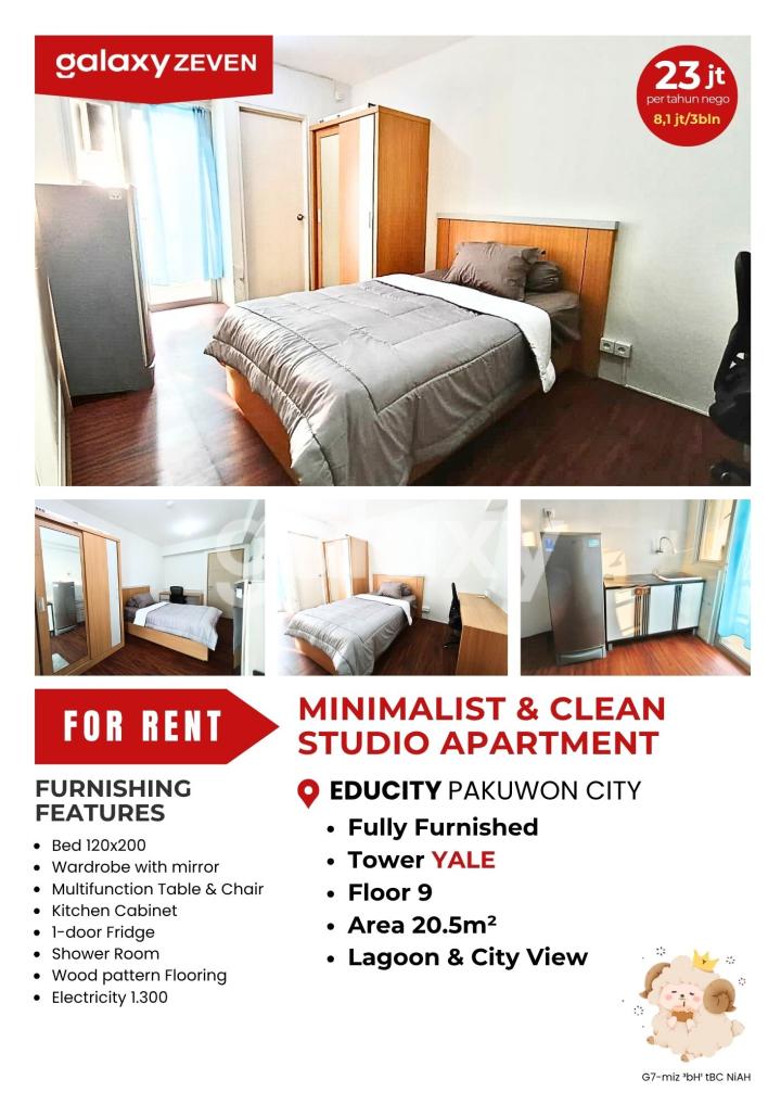 SEWA ANEKA STUDIO FURNIS APARTEMEN EDUCITY Pilihan Lantai 1- 31 Luas Bangunan 20.5 - 21m² Kamar Mandi 1 PLN 900, 1.300, 2.200 View / pemandangan: Pool View, City View, Mountain View, dll Harga Mulai : ✓ 23 juta per tahun ✓ 2,4 juta per bulan FASILITAS: - Private Lobby - Free Akses to Swimmimg Pool - Free Akses to Gym/Fitness - Tempat Bermain Anak (free) - Jogging Track (free) - Free 1 Parking Lot - Laundry Shops - Convenience Stores/mini marts - Depot, Pujasera - Apotik LOKASI & JARAK 50m - Sekolah Gloria 260m - Sekolah Xin Zhong 350m - Pakuwon City Mall 700m - Universitas Widya Mandala Pakuwon City 1 km - Sekolah Cita Hati 2,7 km - ITS (Institut Teknologi Surabaya) 5 km - RS Mitra Keluarga Kenjeran 5,3 km - Galaxy Mall 6 km - Unair Kampus C 8,1 km - Unair Kampus B 20 km - Juanda Airport
