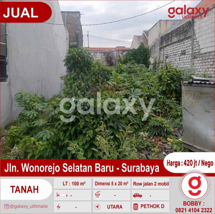Di jual tanah kavling di Jln. Wonorejo Selatan Baru - Surabaya dekat Superindo Merr, Perum Nirwana Executif, Park Sunrise & Pandugo Luas Tanah : 100 m² Dimensi 5 x 20 m² Hadap Utara Surat petok D Row jalan 2 mobil loss Lokasi dekat pintu gapura 0 jalan raya Harga : 420 jt / Nego dikit More Info : Bobby Galaxy Ultimate